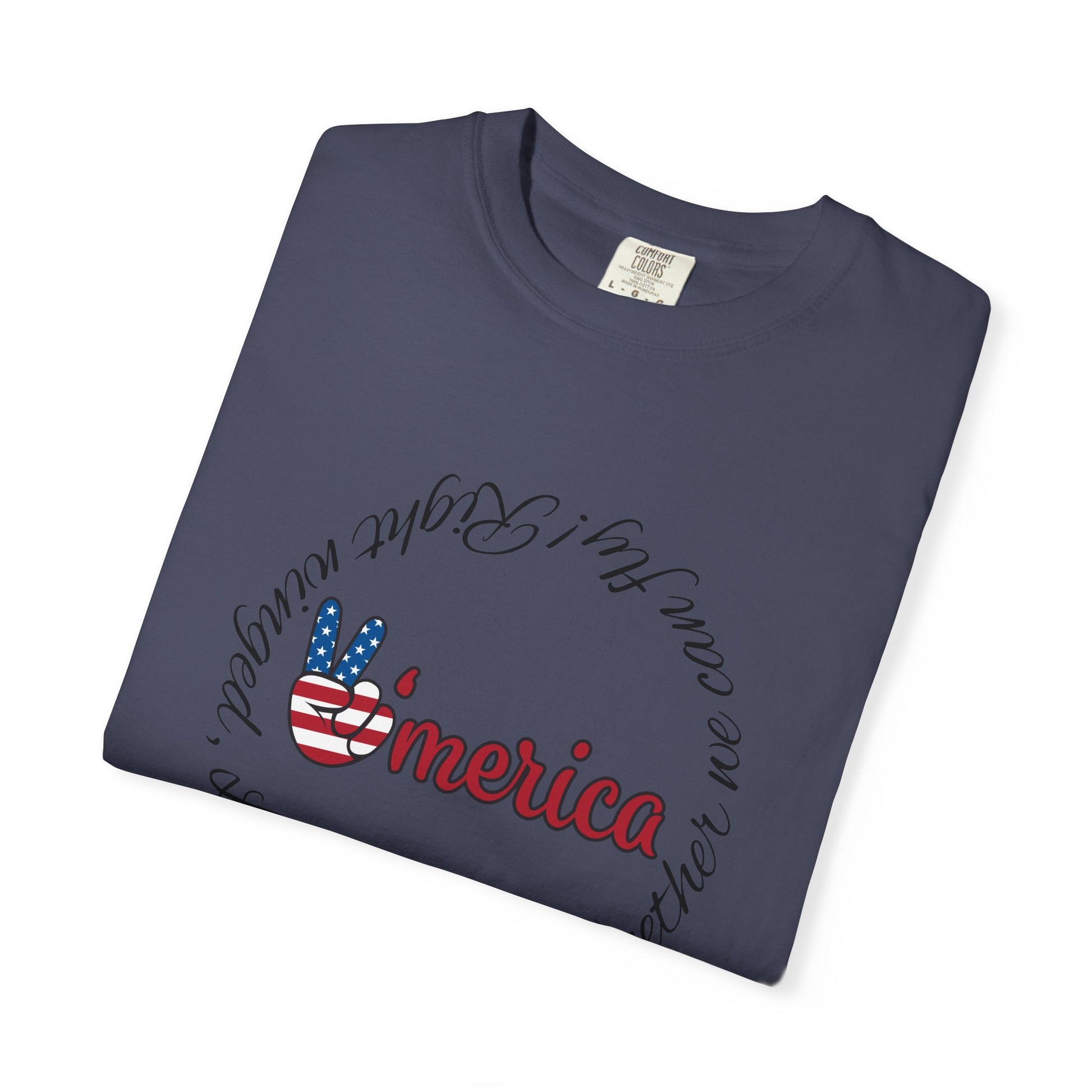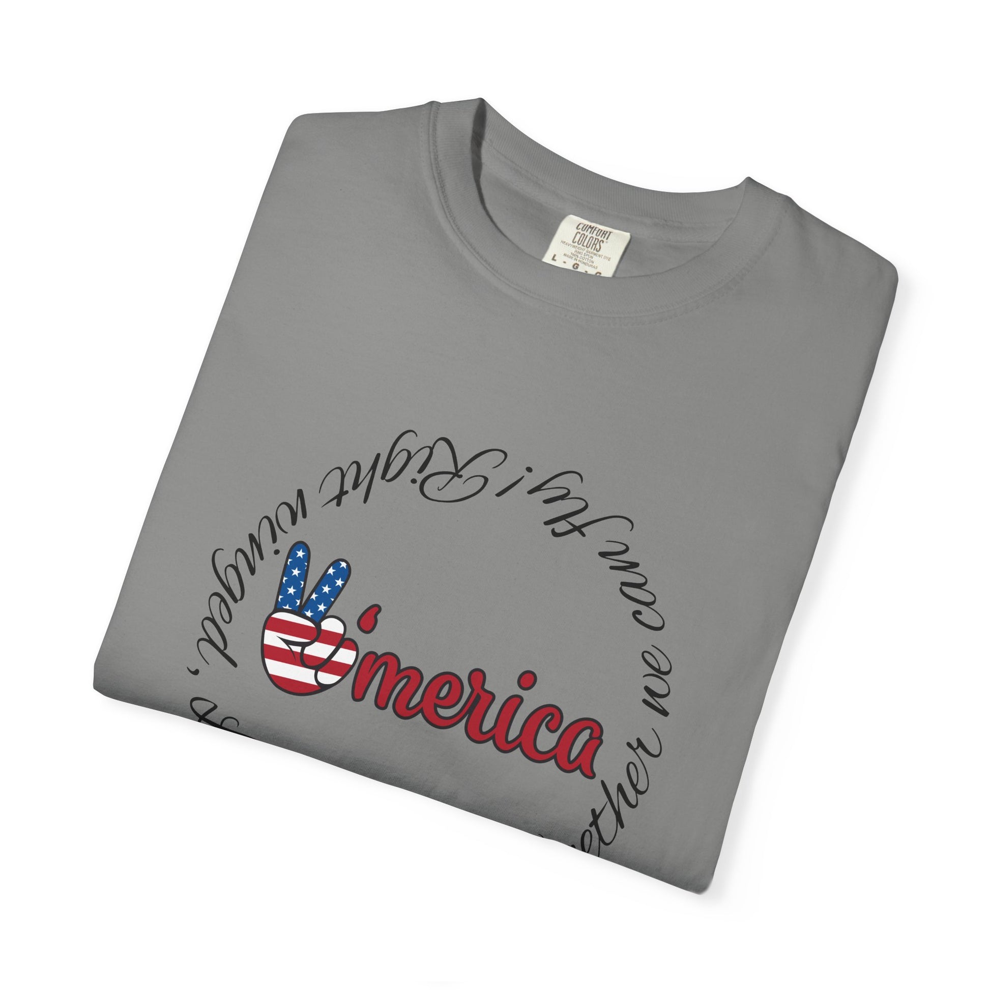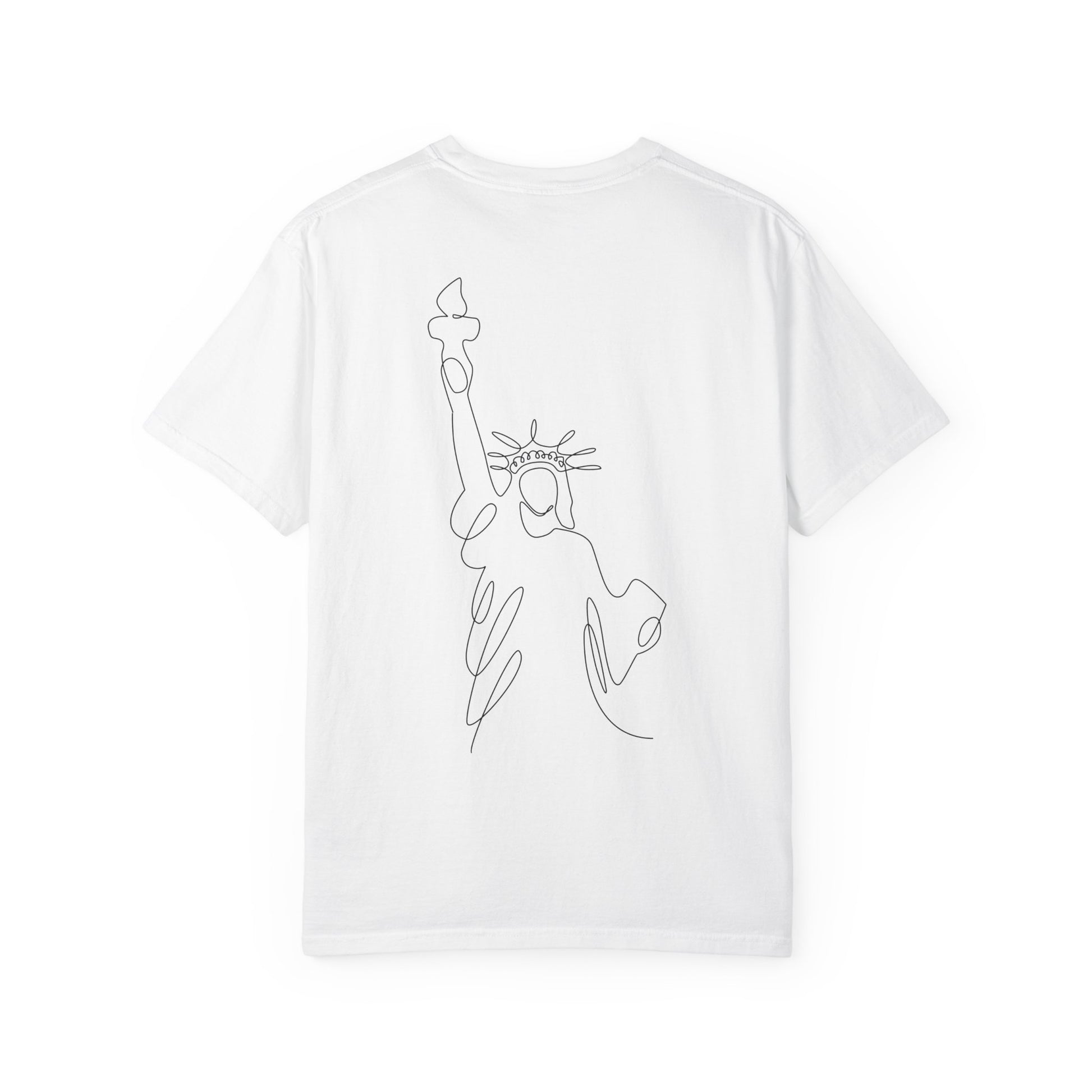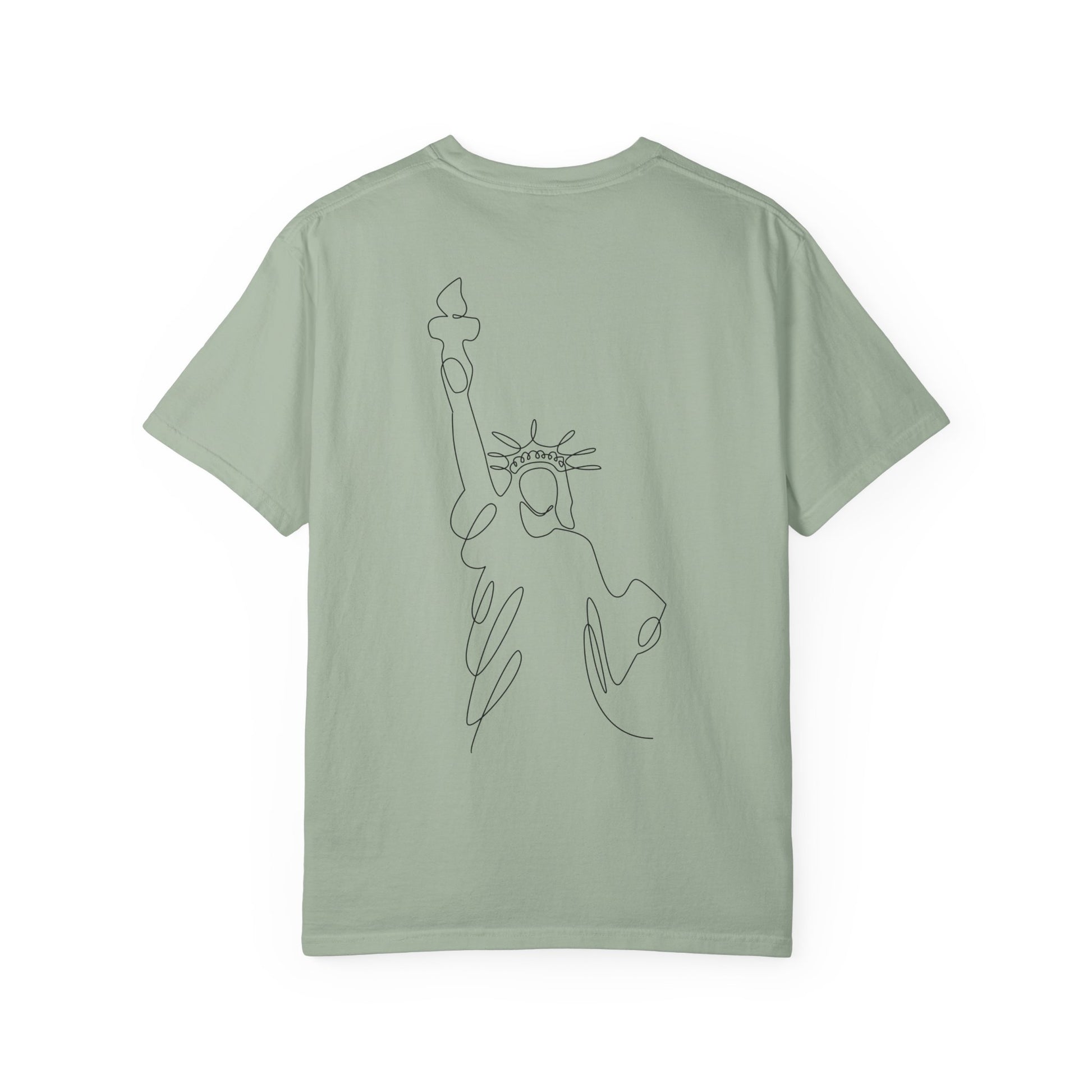 A soft, garment-dyed cotton tee printed with a calm, Americana-inspired design. The front shows a friendly, hand-lettered “’merica” accented by a small peace-sign hand painted in flag colors, surrounded by a flowing circular script. On the back a single-line sketch of the Statue of Liberty keeps the look minimal and modern. Lightweight yet substantial, the relaxed-fit shirt drapes easily over layers and wears in with time — the kind of tee you reach for on slow, sunny afternoons, backyard barbecues, or casual city strolls. It reads like a quiet, personal nod to American ideals rather than loud patriotism: thoughtful, worn-in, and quietly proud.